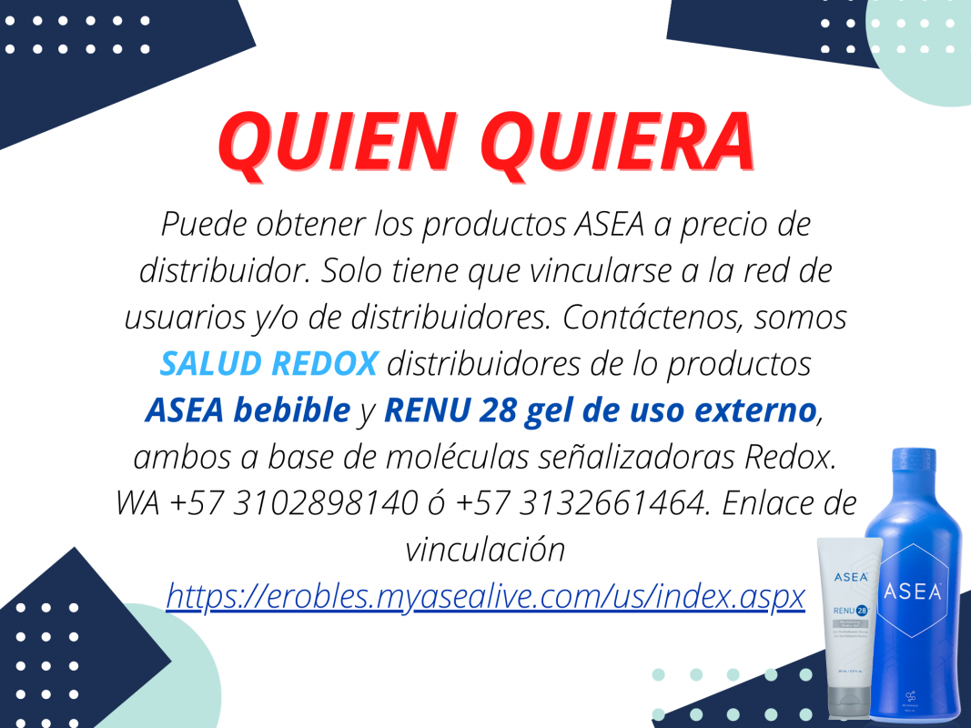 - Si alguien de nuestro vinculados a nuestra organización comercial SALUD REDOX, que publicitan en esta sección, dejare de estar activo como distribuidor independiente de los productos ASEA, pierde la concesión o los beneficios de poder publicitar en esta página web, salvo que pague a la Organización la suma de $1.200.000 (un millón doscientos mil pesos M/C), por la anualidad de su publicación.